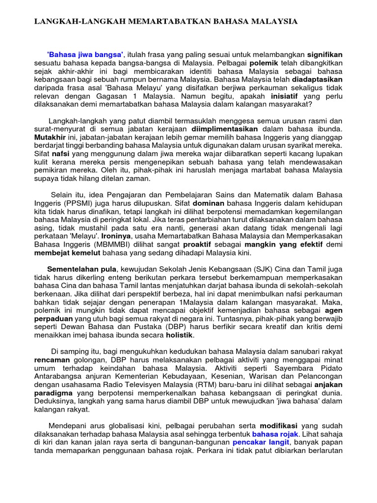 Pada saat perhatian hampir semua orang tertumpu pada globalisasi dasar langit terbuka ledakan maklumat pencapaian taraf negara maju sepenuhnya menjelang 2020 dan segala agenda besar lain yang merangsang cita manusia terasa ironis juga apabila kita masih perlu berbicara tentang nasib. Memartabatkan bahasa Melayu memerlukan usaha secara berterusan. Contoh karangan spm usaha-usaha memartabatkan bahasa malaysia Malaysia dan Nusantara mempunyai bahasa pertuturan tersendiri iaitu bahasa Malaysia.